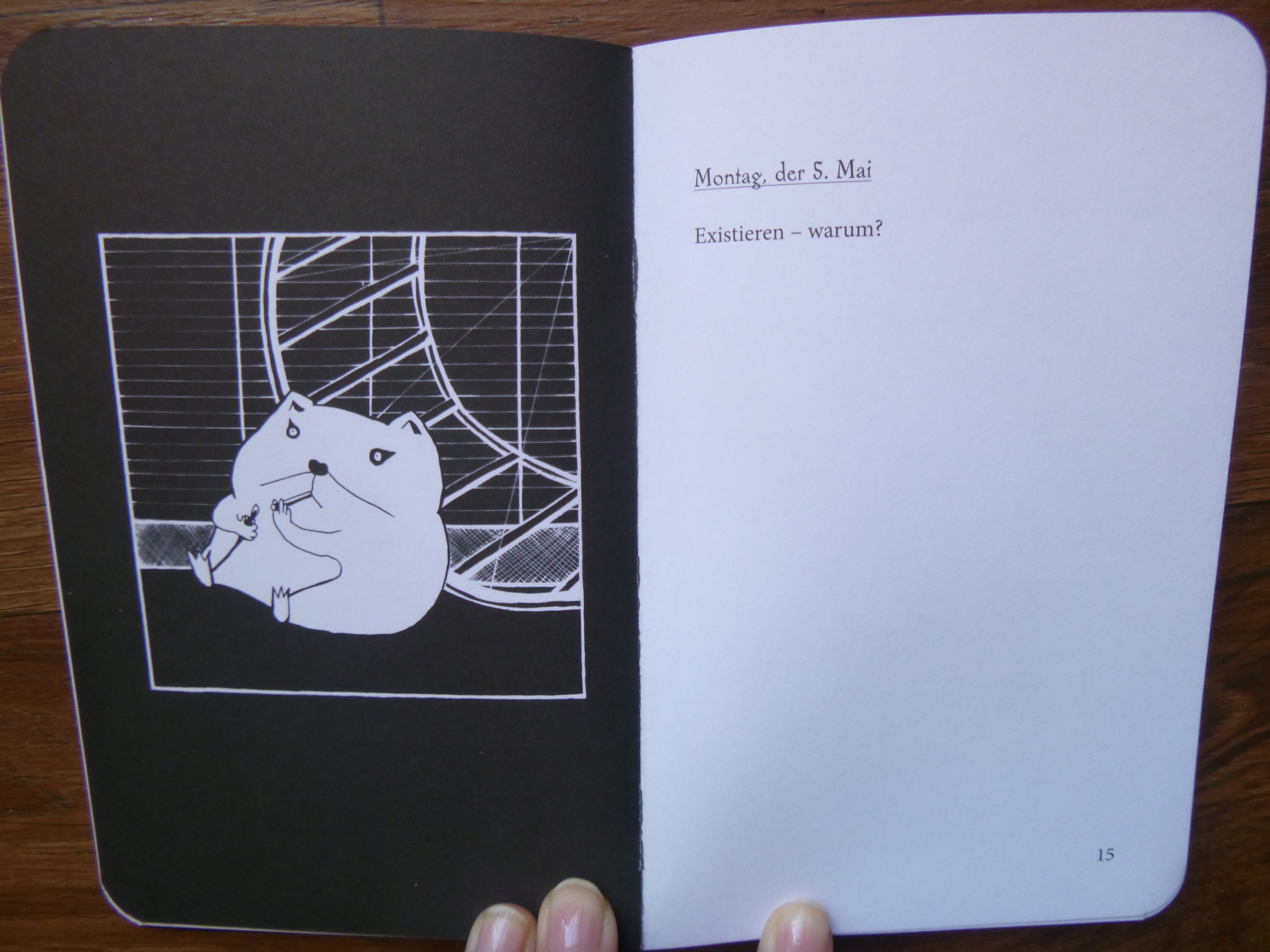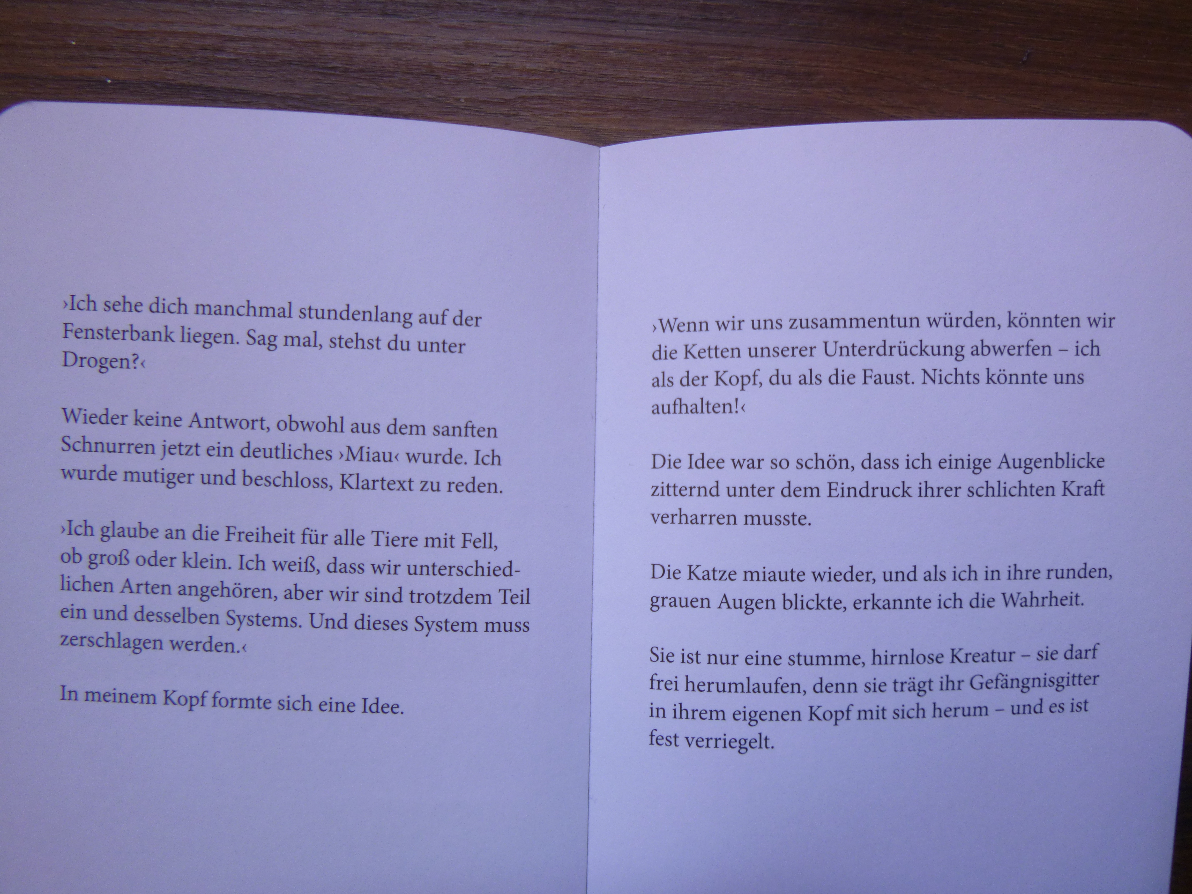 Schön finde ich besonders das Vorwort. Das hat der Herausgeber höchstselbst verfasst: M. E. Nagerstein, Ph. D. in Hamsterlinguistik und -philosophie, Universität von Mausachusetts. Das fand ich schon mal zum Schmunzeln. Der fiktive Herausgeber beschreibt nun also das Objekt seines wissenschaftlichen Interesses: einen vor sich hin philosophierenden Hamsters. Das fand ich besonders spannend. Natürlich ist das Büchlein beim ersten Durchlesen witzig, aber wenn man genau darauf achtet, stecken da tatsächlich ziemlich philosophische Überlegungen drin.
